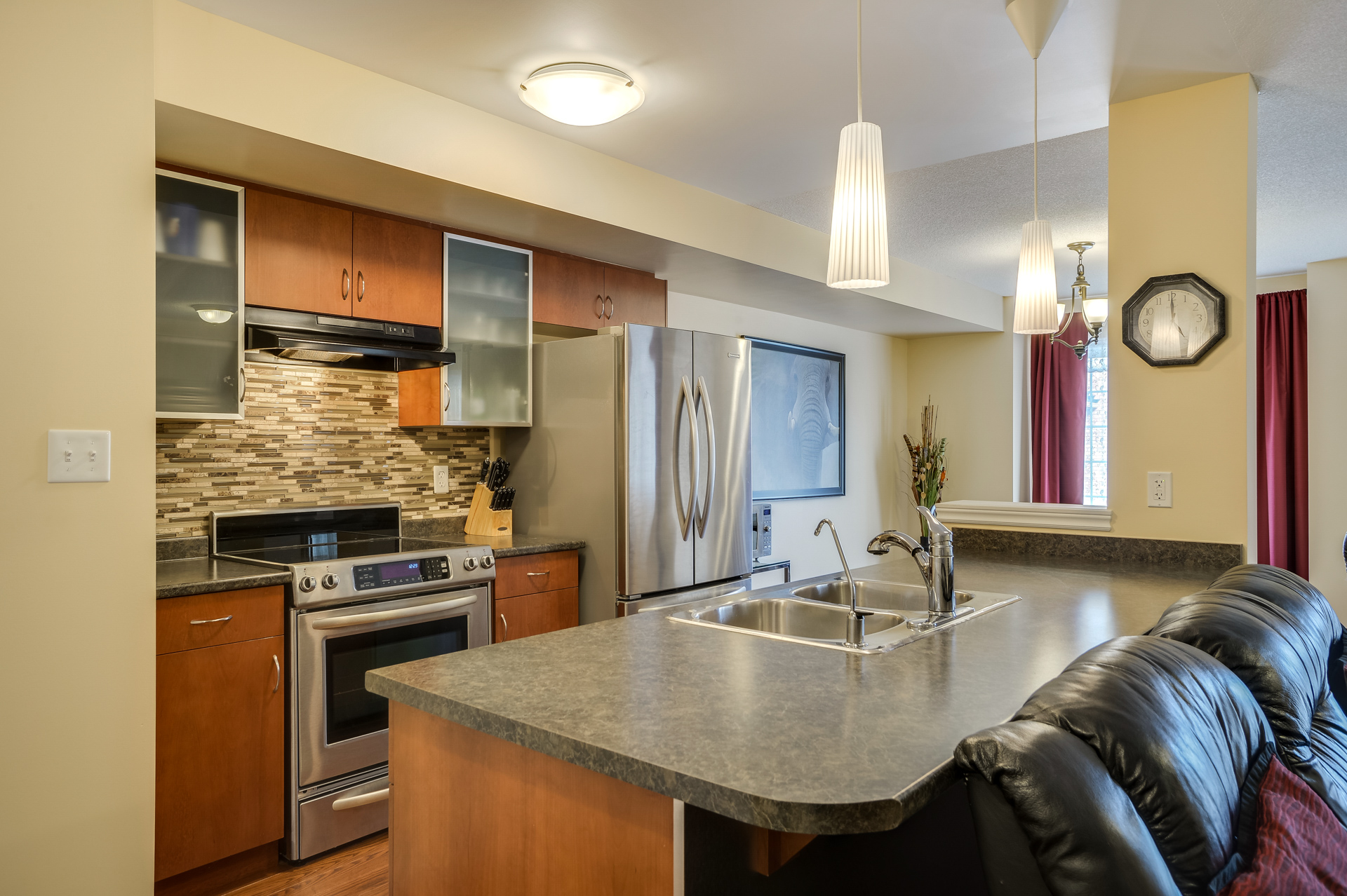 Modern Kitchen With Stainless Steel Appliances And Breakfast Bar, Walkout To Covered Balcony From Living Room.